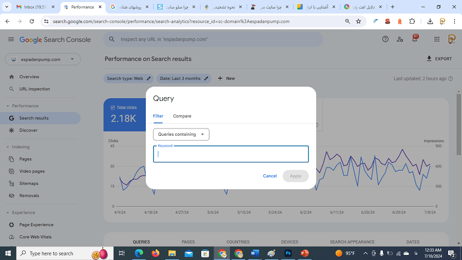 زمانی که وارد سرچ کنسول می شوید و قصد شناسایی صفحاتی که افت کرده اند را دارید ممکن است با صفحاتی مواجه شوید که هدف شما نباشند بنابراین لازم است که صفحات را به گونه ای چیدمان کنید که صفحات هدف را مشاهده کرده و بر روی آن ها تمرکز کنید. برای این منظور لازم است طبق تصویر زیر از سرچ کنسول گزینه new را کلیک کنید و بر روی صفحه مورد نظر (کوئری) کلیک کنید.